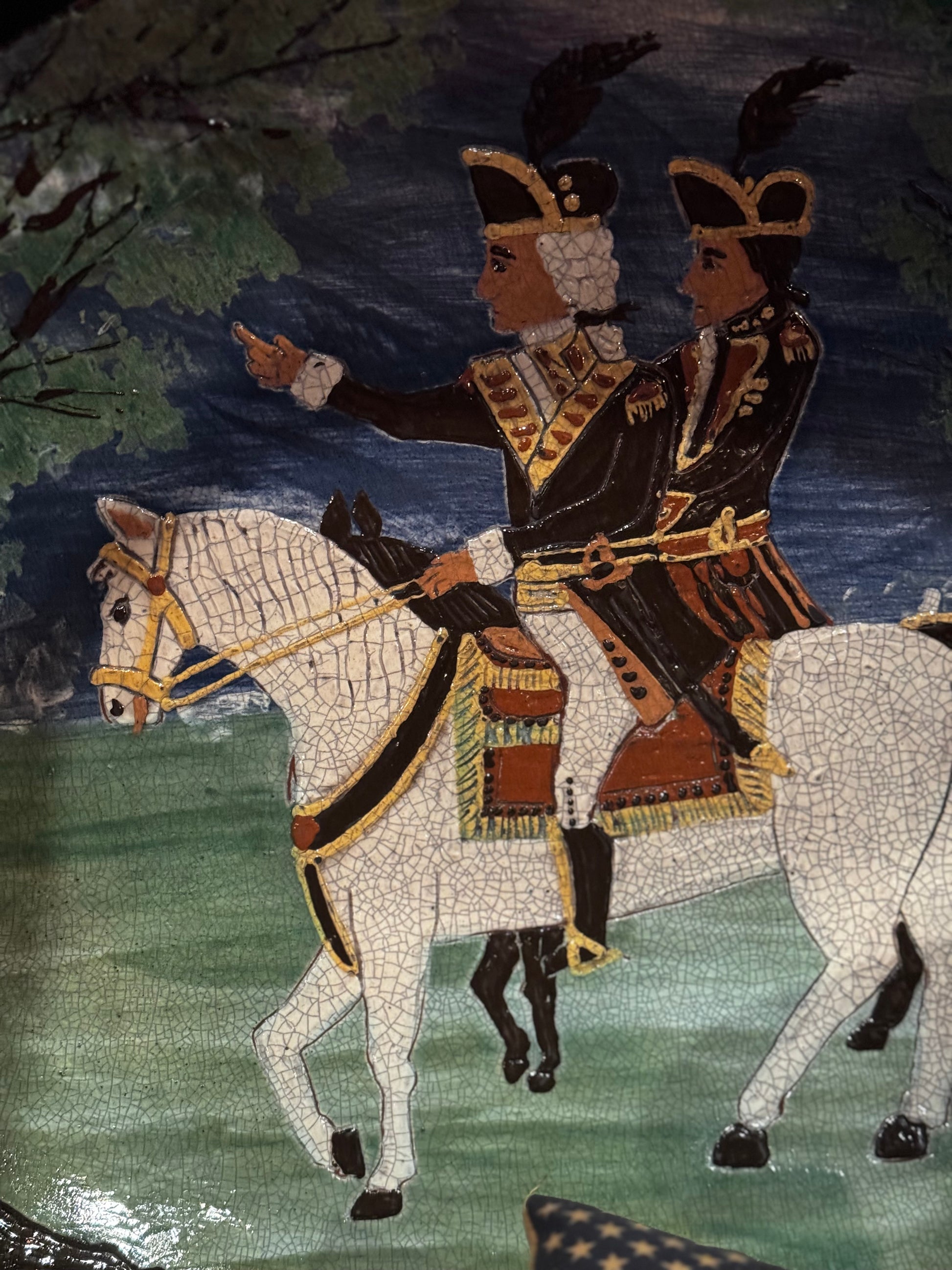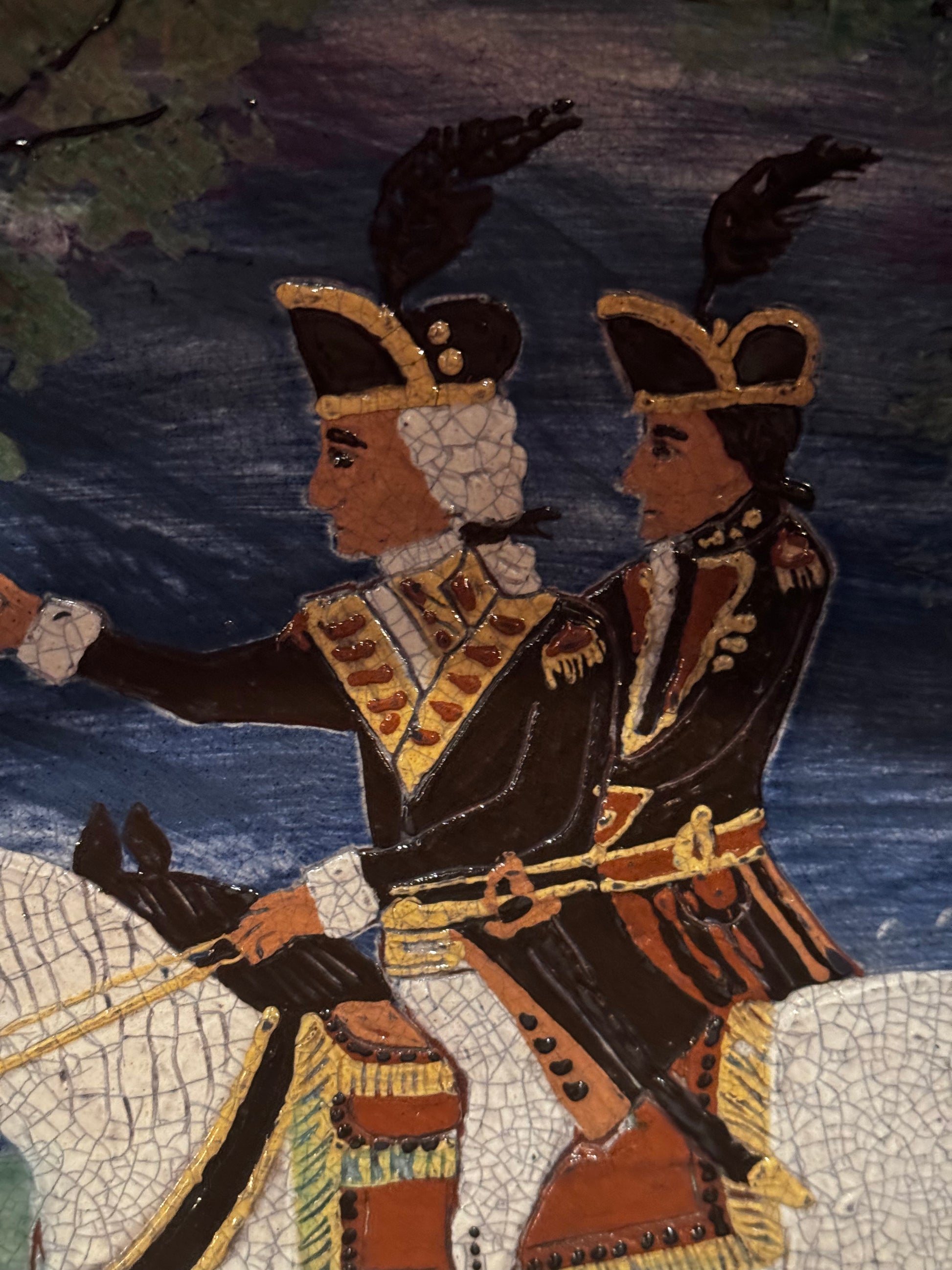 This amazing large platter from the Workshops of David T Smith measures 13.5” x 16.5”. This platter is hand-painted with Washington and Lafayette. This is definitely a statement platter. Will look fabulous on your fireplace mantle or a large dining room table. Each one is hand painted so they will slightly vary.