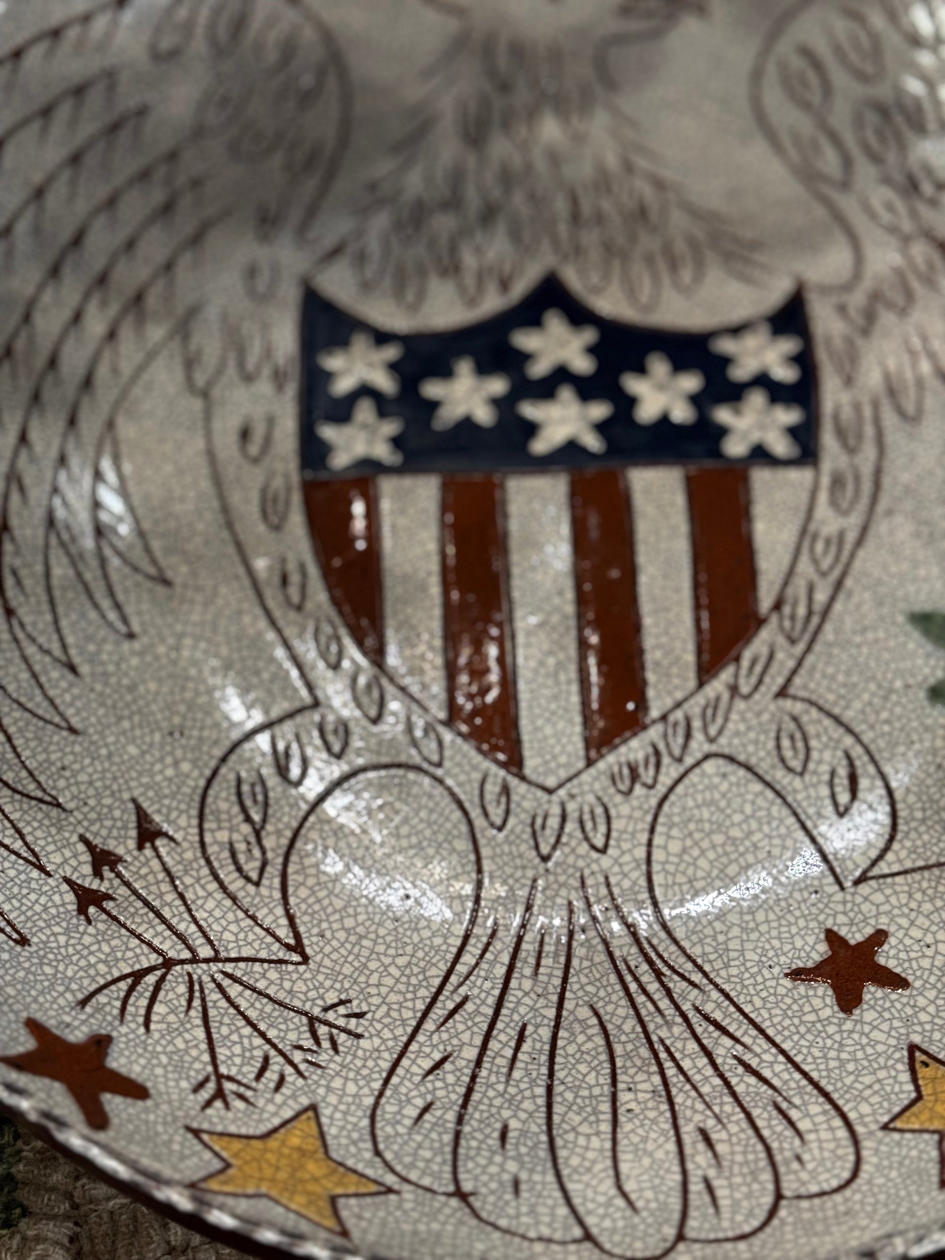 This beautiful plate from the Workshops of David T Smith measures approximately 13 inches around. Has a beautiful large hand painted eagle with a patriotic shield. This plate is not food safe and will look perfect all summer long.