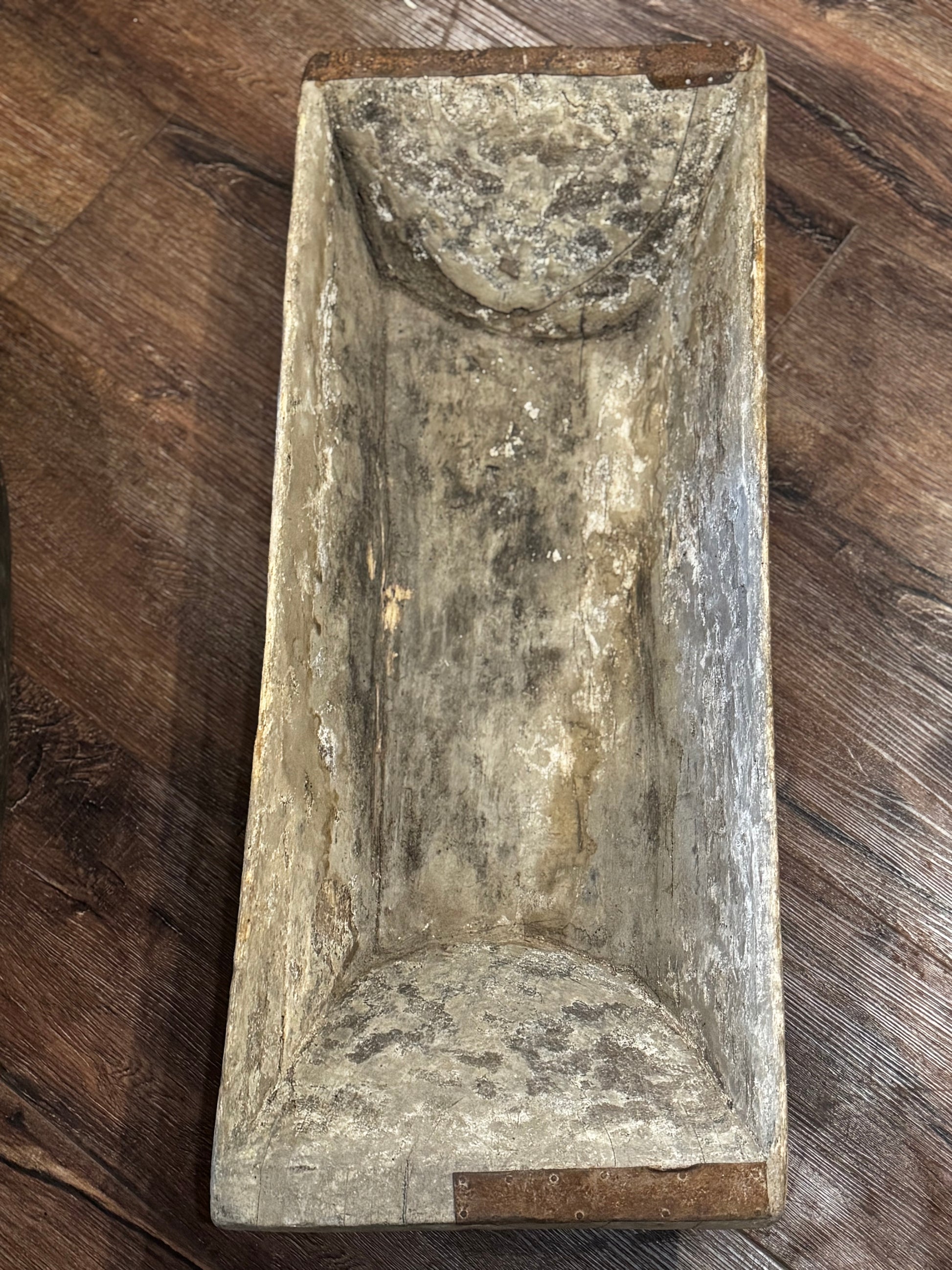 This rustic Early trencher is perfect for your harvest table. The overall with measures 35 inches long by 14 inches wide and approximately 6.5 inches deep. Has some early repairs with metal.