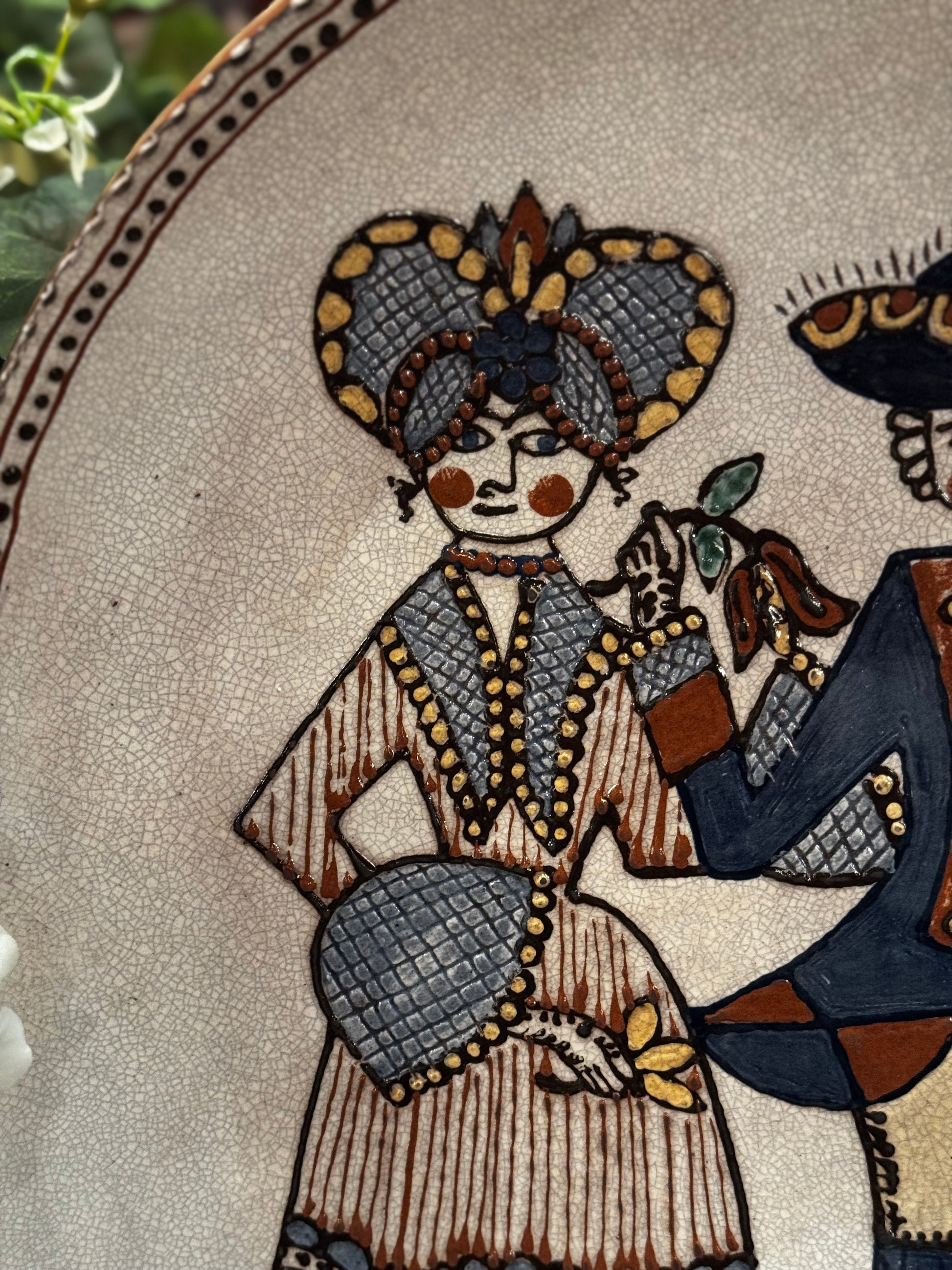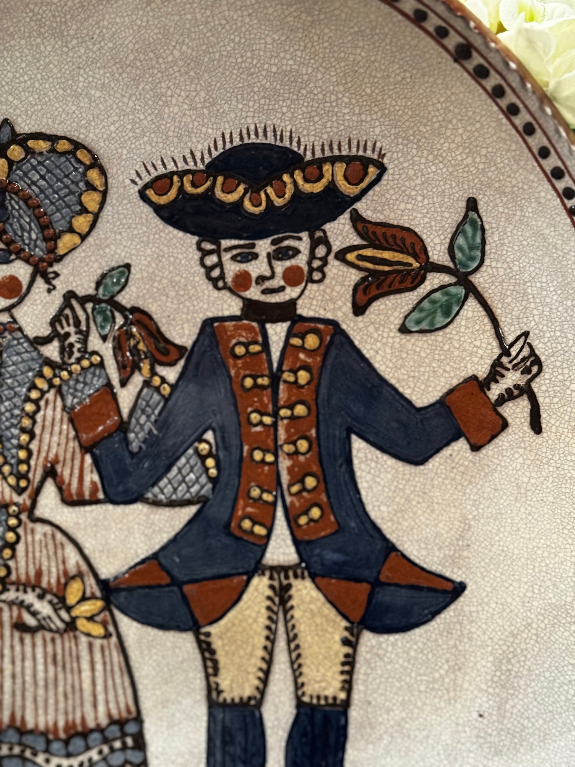 This absolutely stunning large oval platter from the Workshops of David T Smith features a formal George Martha, Washington. This platter is not food safe. The overall measurements are 16 inches tall by 13 inches wide. This is a perfect statement piece for your colonial home all year long.
