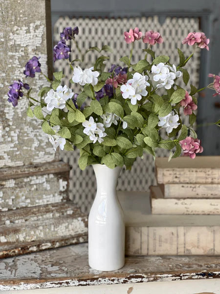 Charming hydrangea-like blooms top arcing stems and are perfectly accented with rounded leaves with pretty variegation. Available in three colors, each sold separately. Size is 20”