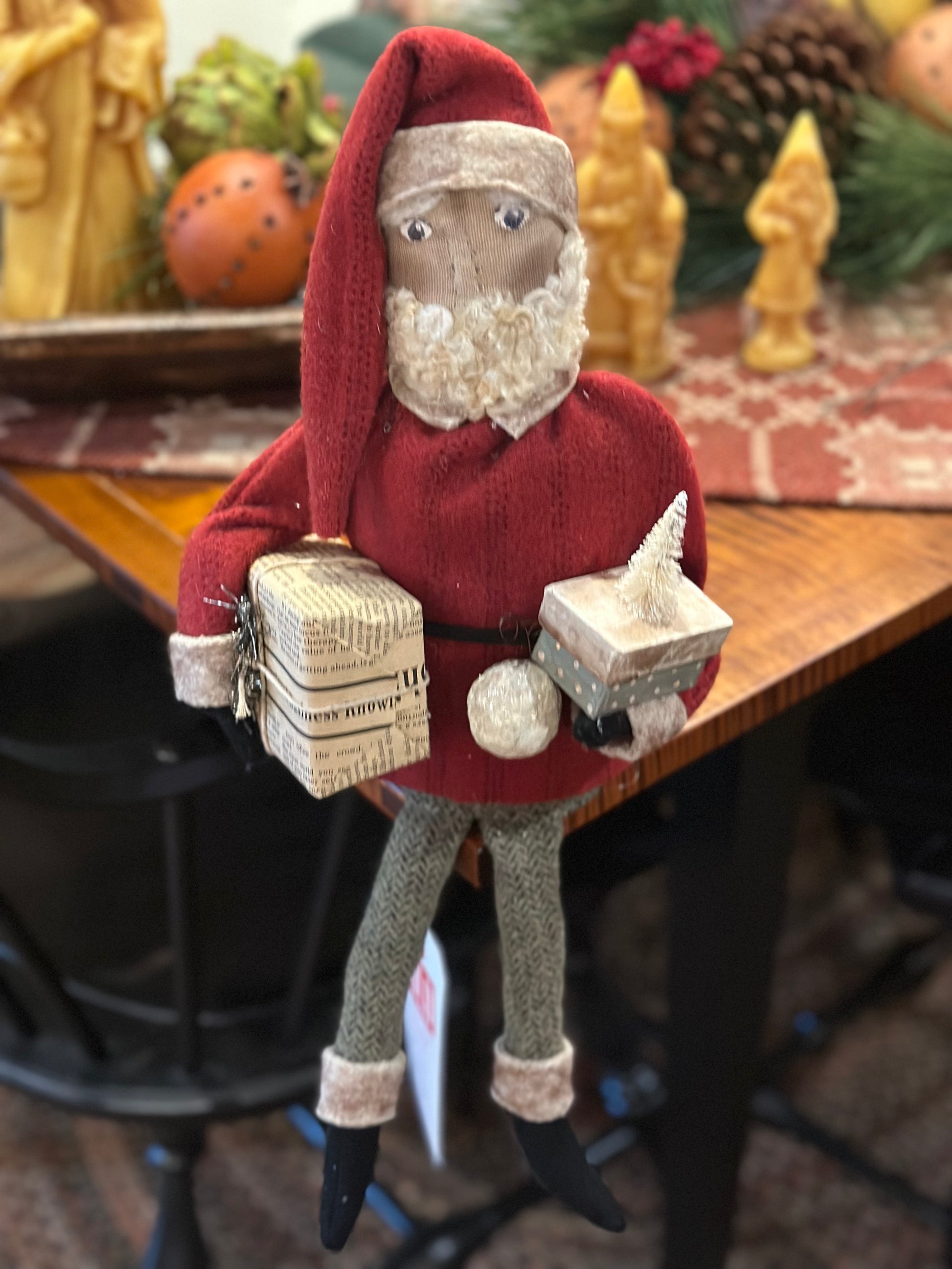 We just love Chris’s work. Each creation is completely handmade. Chris uses wool as her main supply. Then each one is finished with lots of details. Santa Measures 10” tall when sitting