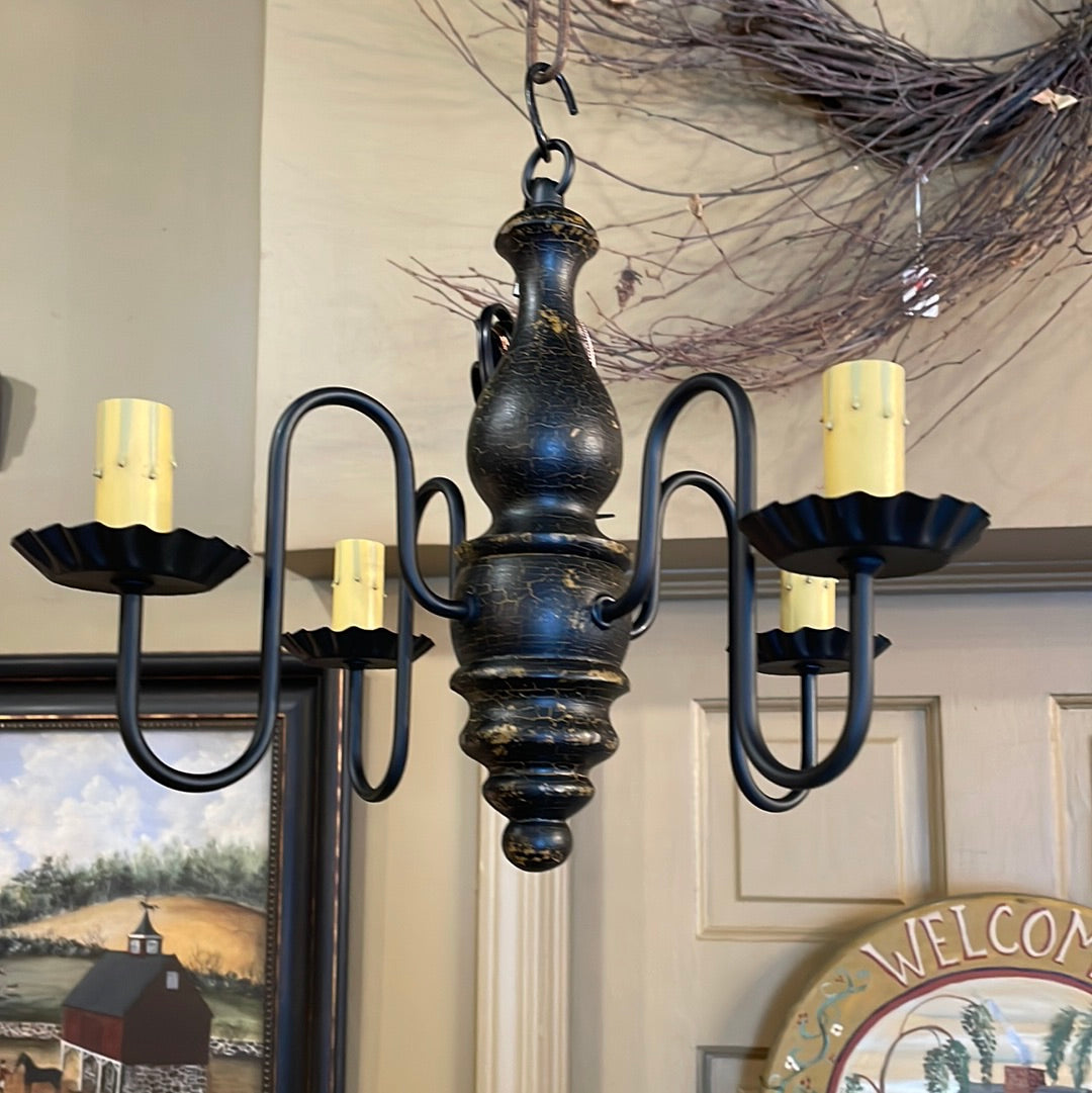 The Abigail is a 4-arm wood chandelier of modest size. Comes with a canopy kit, including 3' of chain, a ceiling plate, and additional hardware. Additional chain & wire are available.