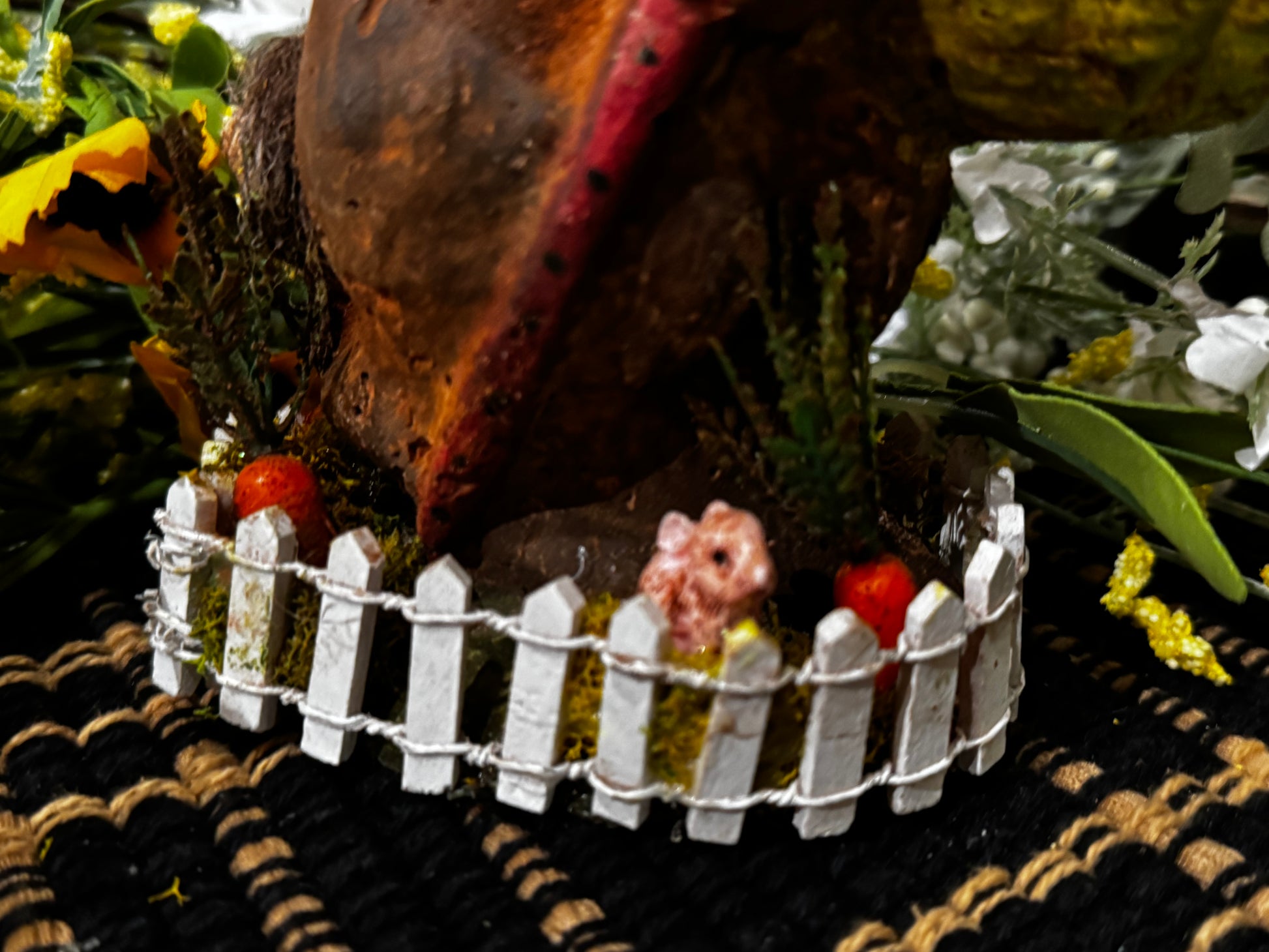 This beautiful Chalkware bunny with a little picket fence around the base measures approximately 9.5 inches tall by 6 inches deep. He’s made of an old chocolate mold with hand, painted eggs and little carrots.