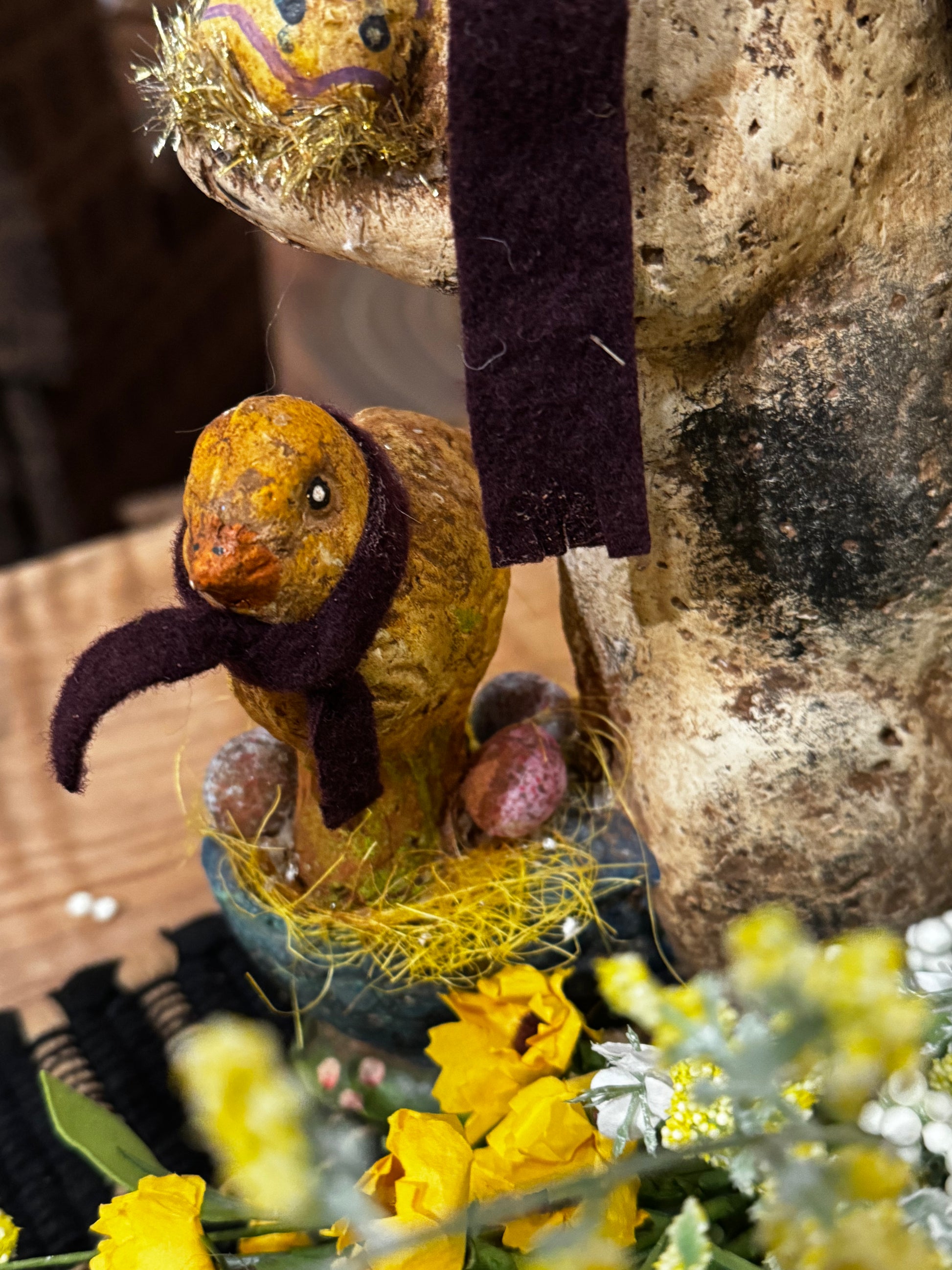 How adorable is this Chalkware bunny with peep. The overall height is 14 inches tall depth is 7 inches. He’s all hand-painted with vintage accessories.