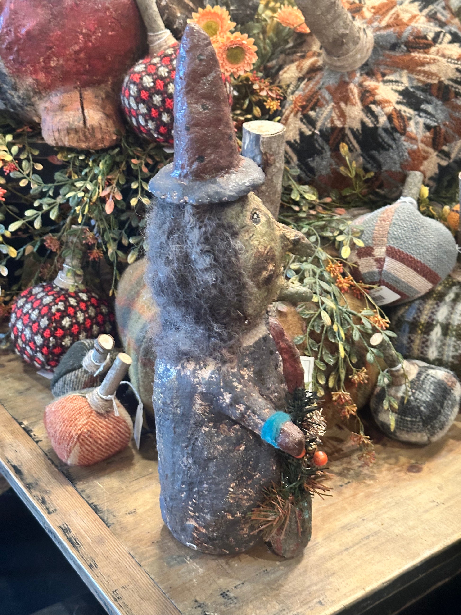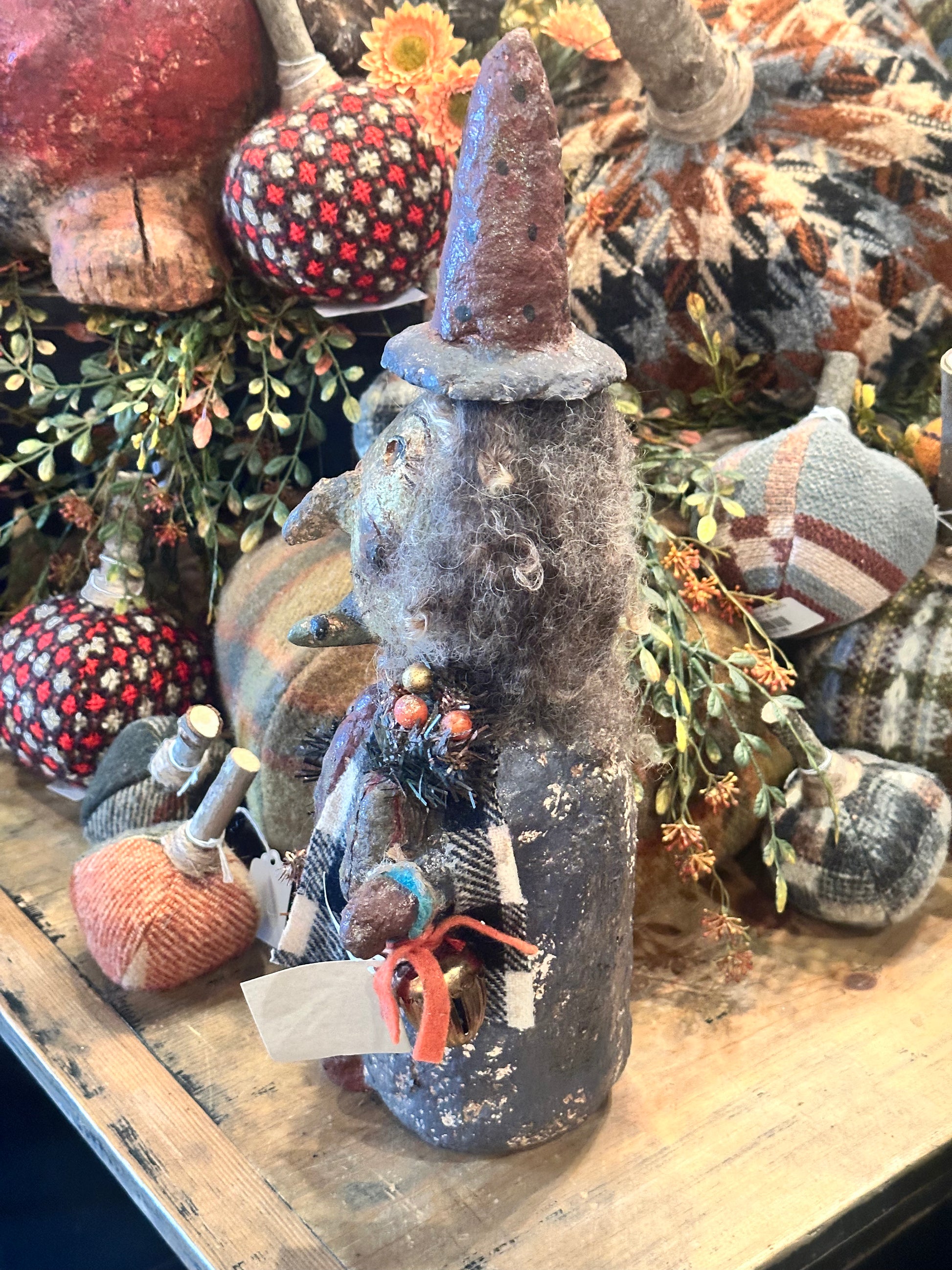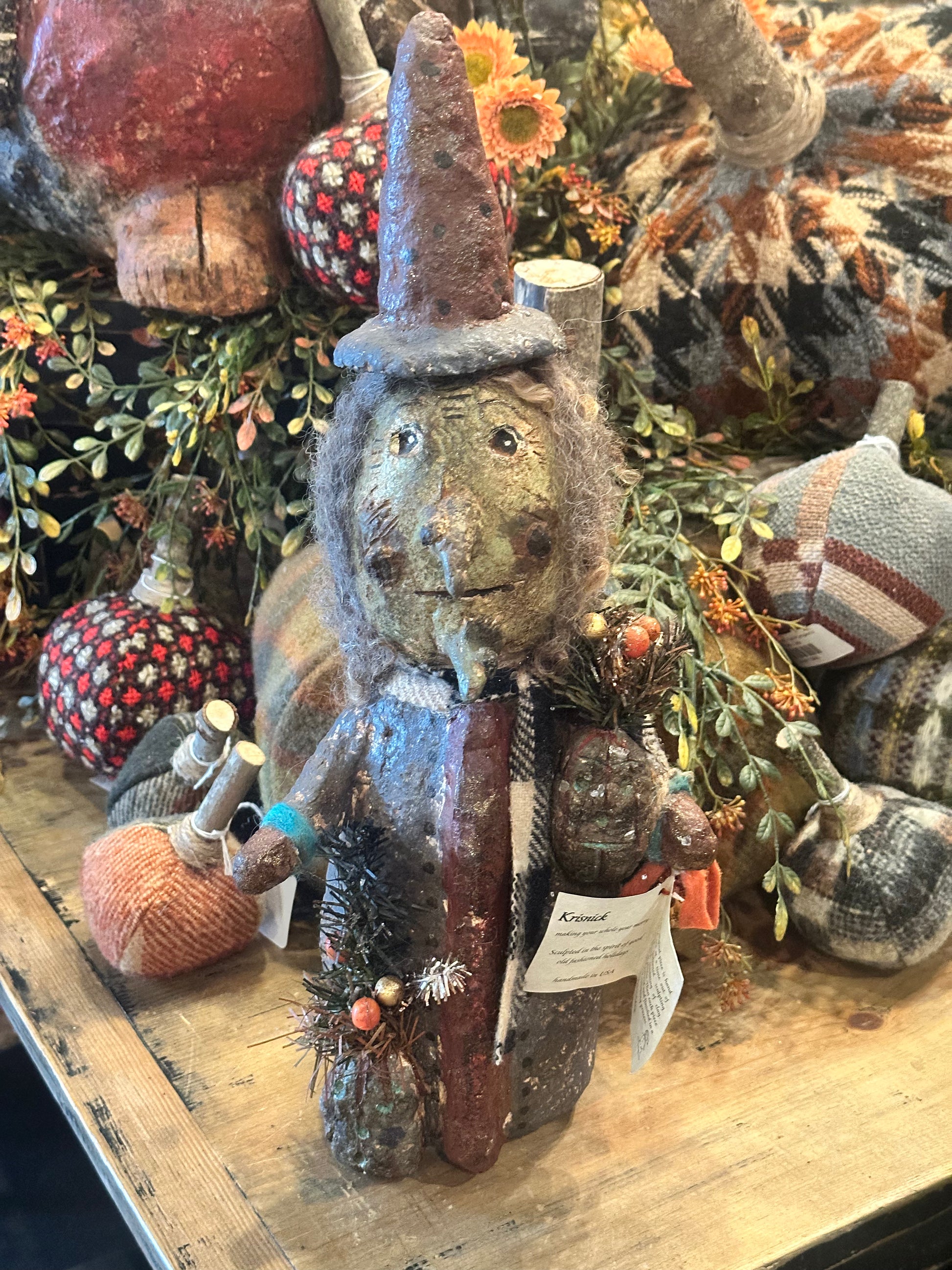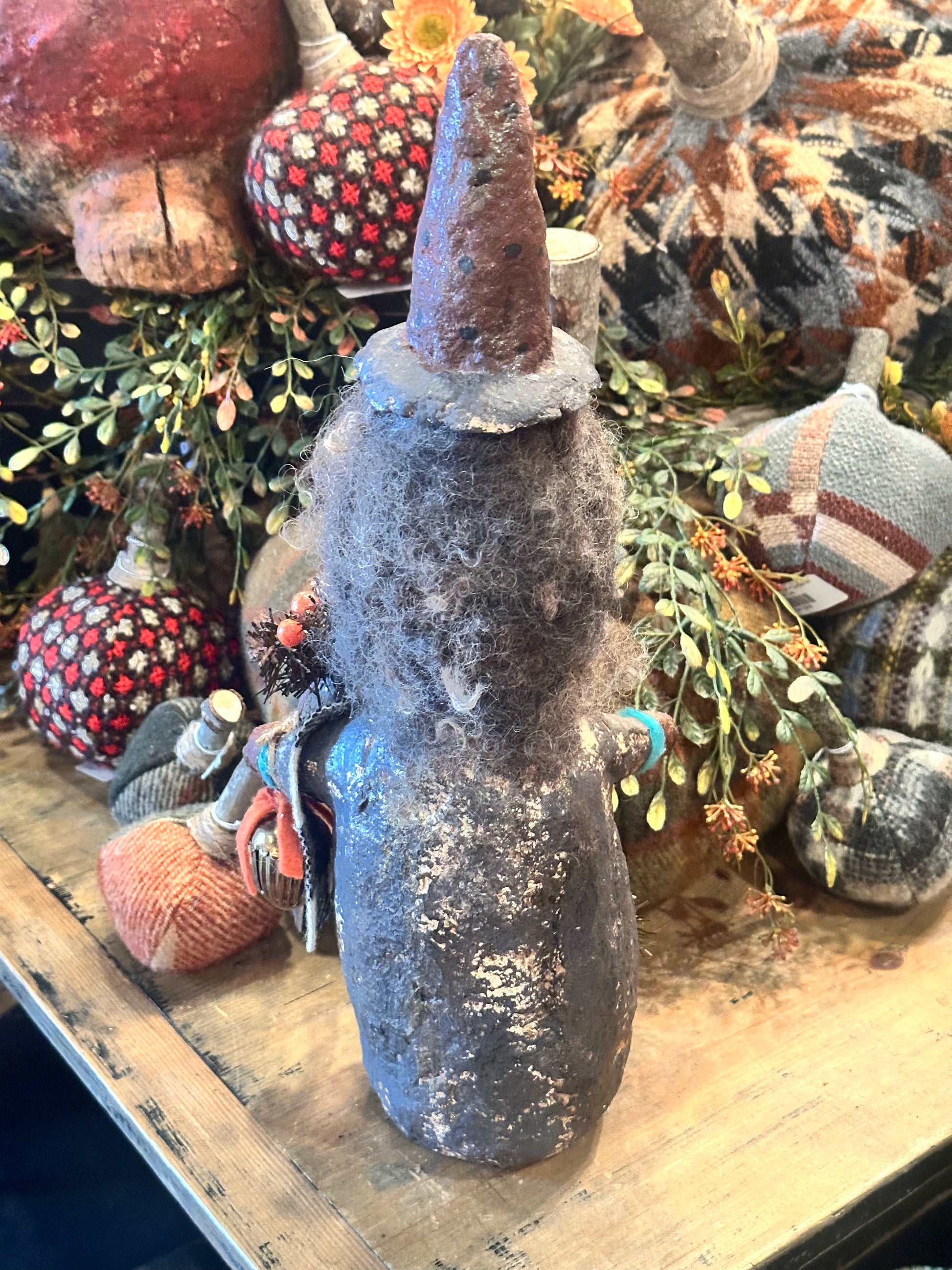 This adorable Halloween witch measures 16 inches tall. She has vintage accessories on her as wool as wool for her hair.