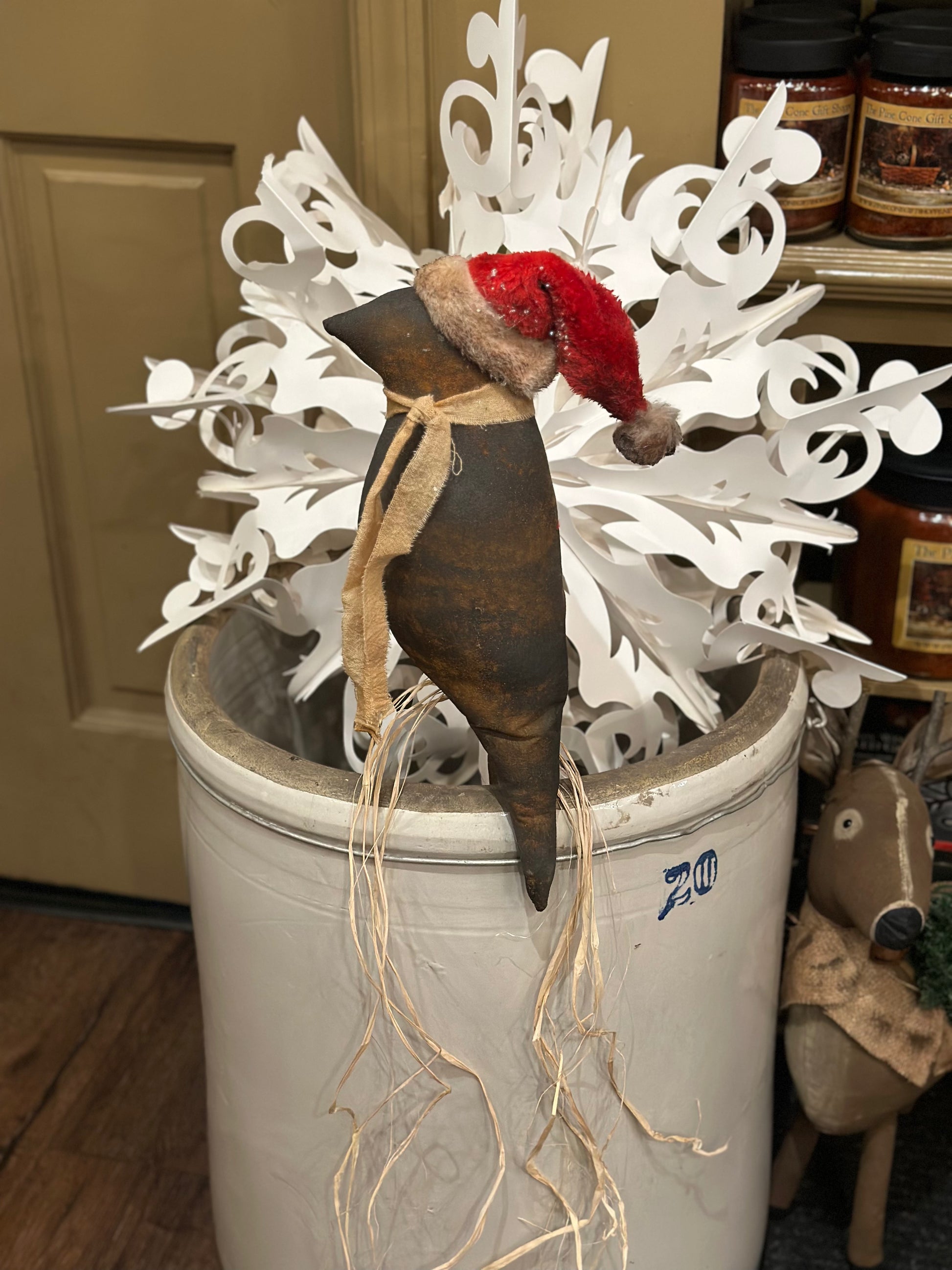 This cute crow indoor poke has a little Santa hat and a little scarf, antiqued with cinnamon and measures approximately 27” in length