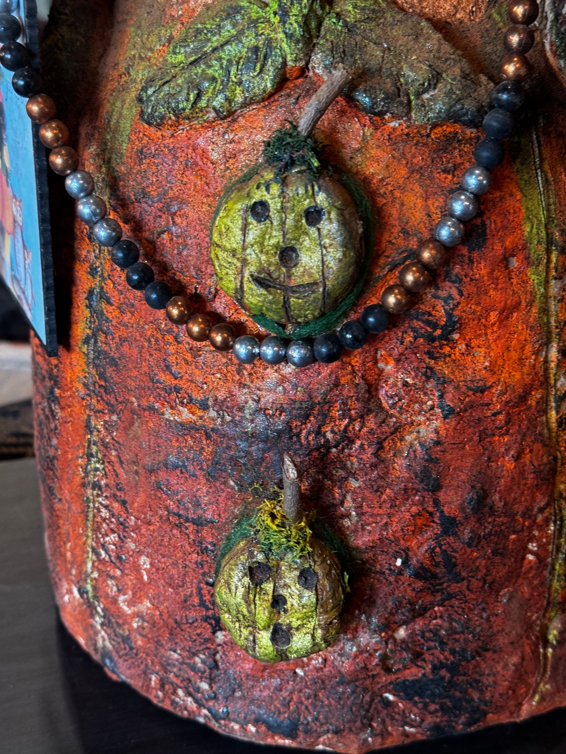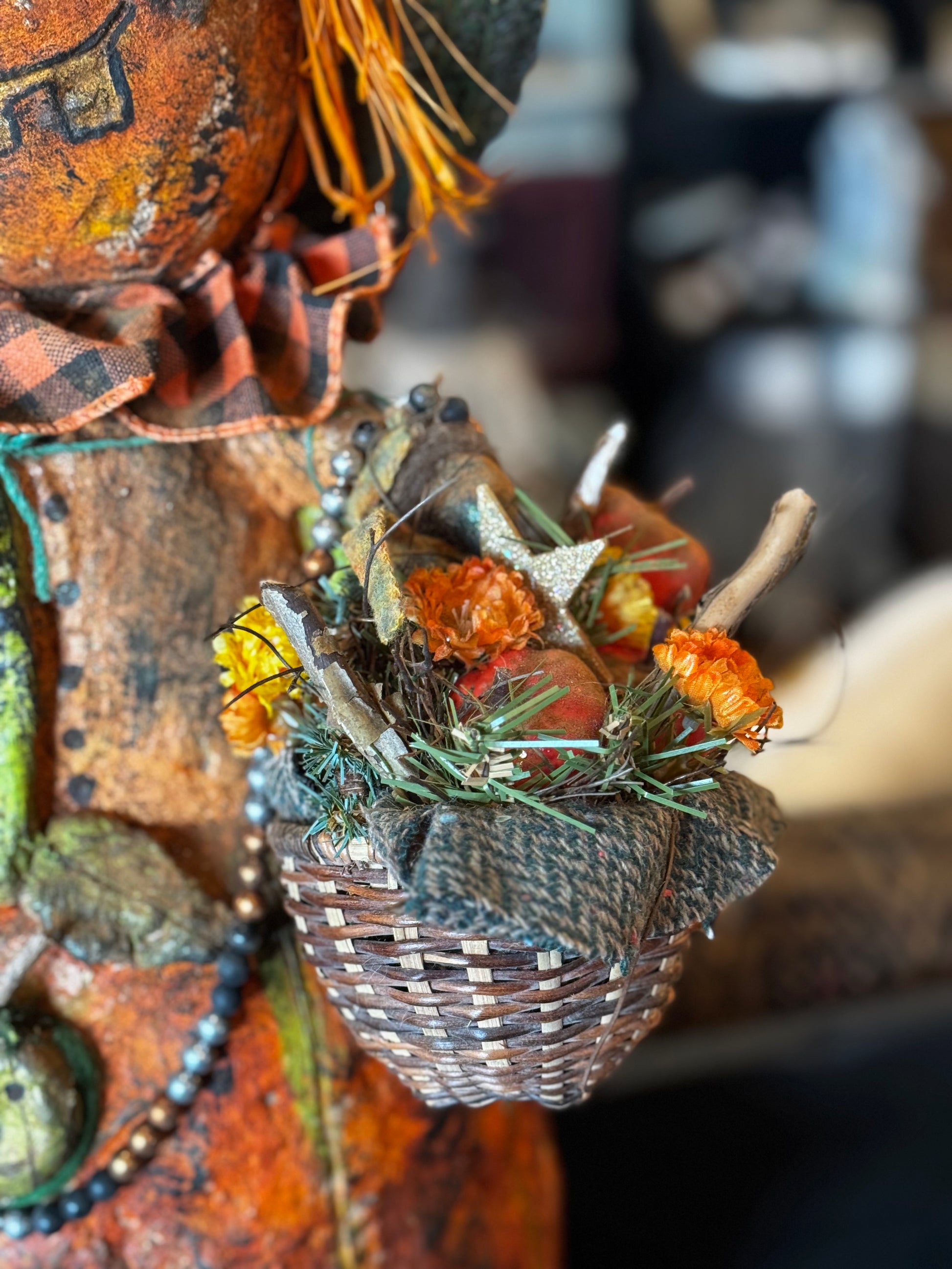 Just absolutely showstopper large standing pumpkin scarecrow is fabulous. He is packed full of details from a vintage postcard to a basket of vintage good goodies. He also comes with an antique straw hat and jack-o’-lantern buttons. His overall height measures 21 inches tall by approximately 12 inches around. This is a one of a kind piece. Don’t miss out.