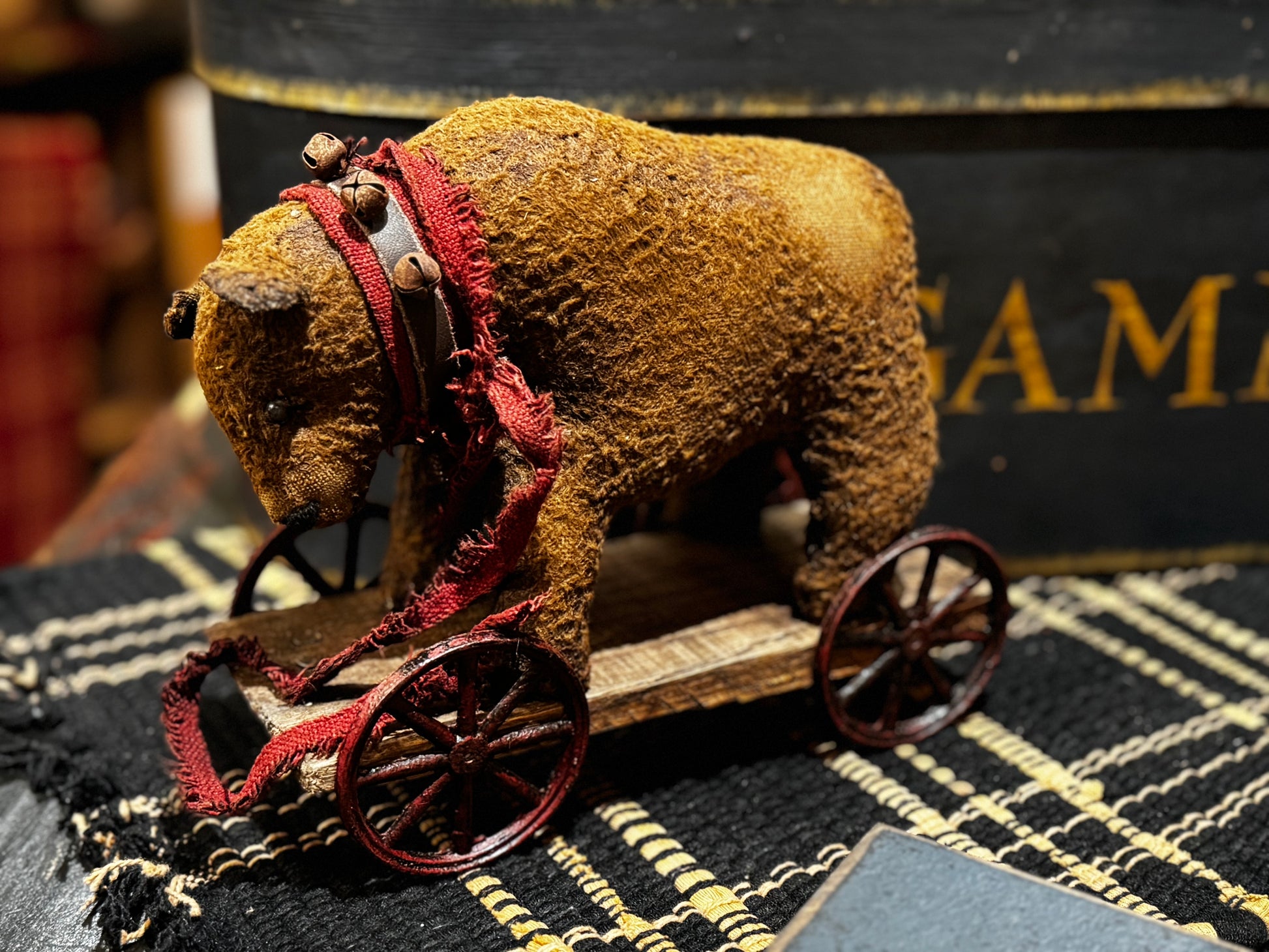 These adorable pool toys and annd jointed bear are made of German Viscose. Each one is handcrafted in Ohio using the best available supplies. The larger bear is on old Barnwood. for his pool toy. Those are perfectly primitive and distressed.