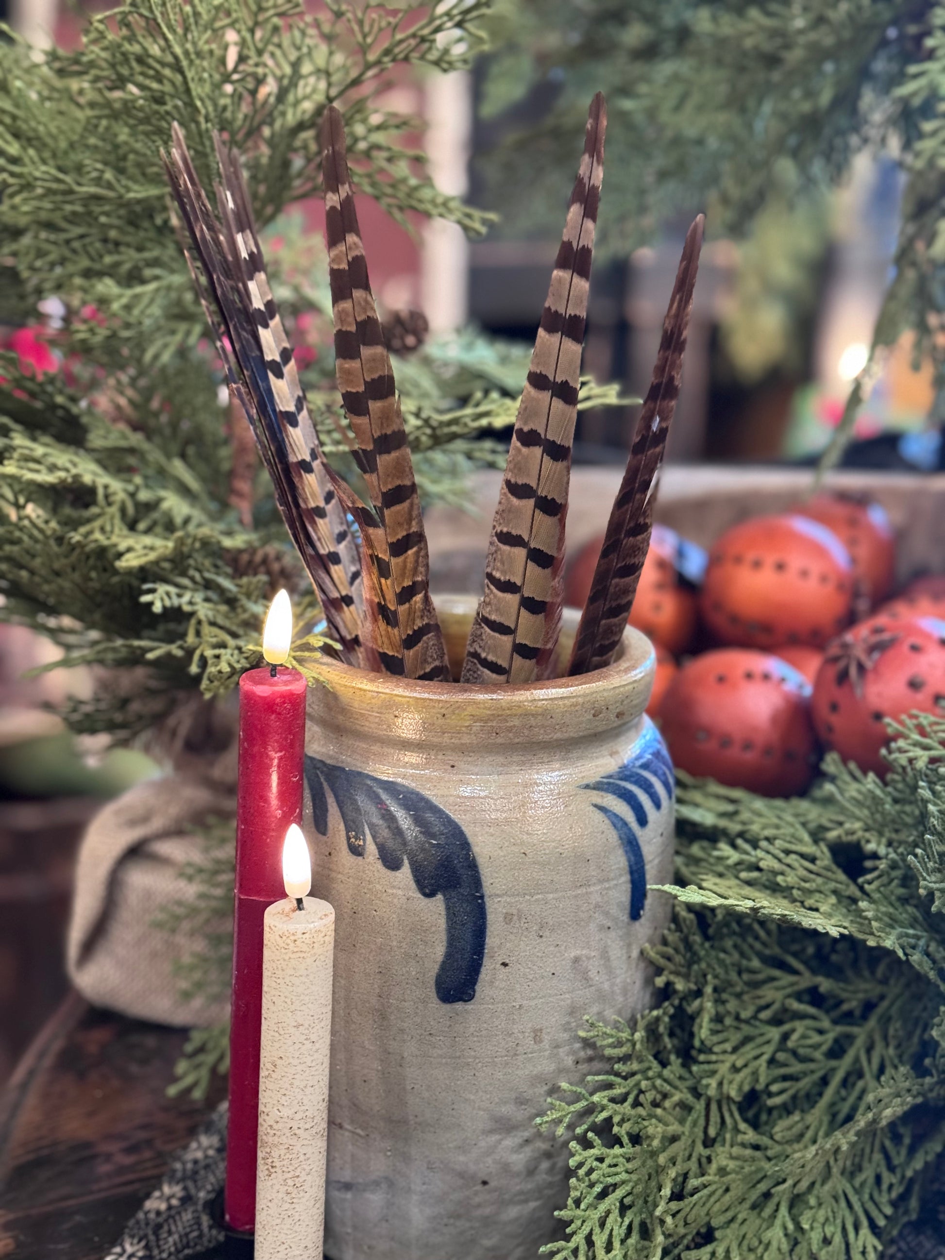 These real pheasant feathers are the perfect look for your colonial and primitive decorating. Use these all year long or throughout the holiday season they look excellent mixed in with pine and cloved oranges, lemons and limes. They also look great in a crock. We offer them in 2 sizes. Sold in packs of 10 each. The smaller ones will be approximately 14” to 16” & the larger ones will be 20” to 24”
