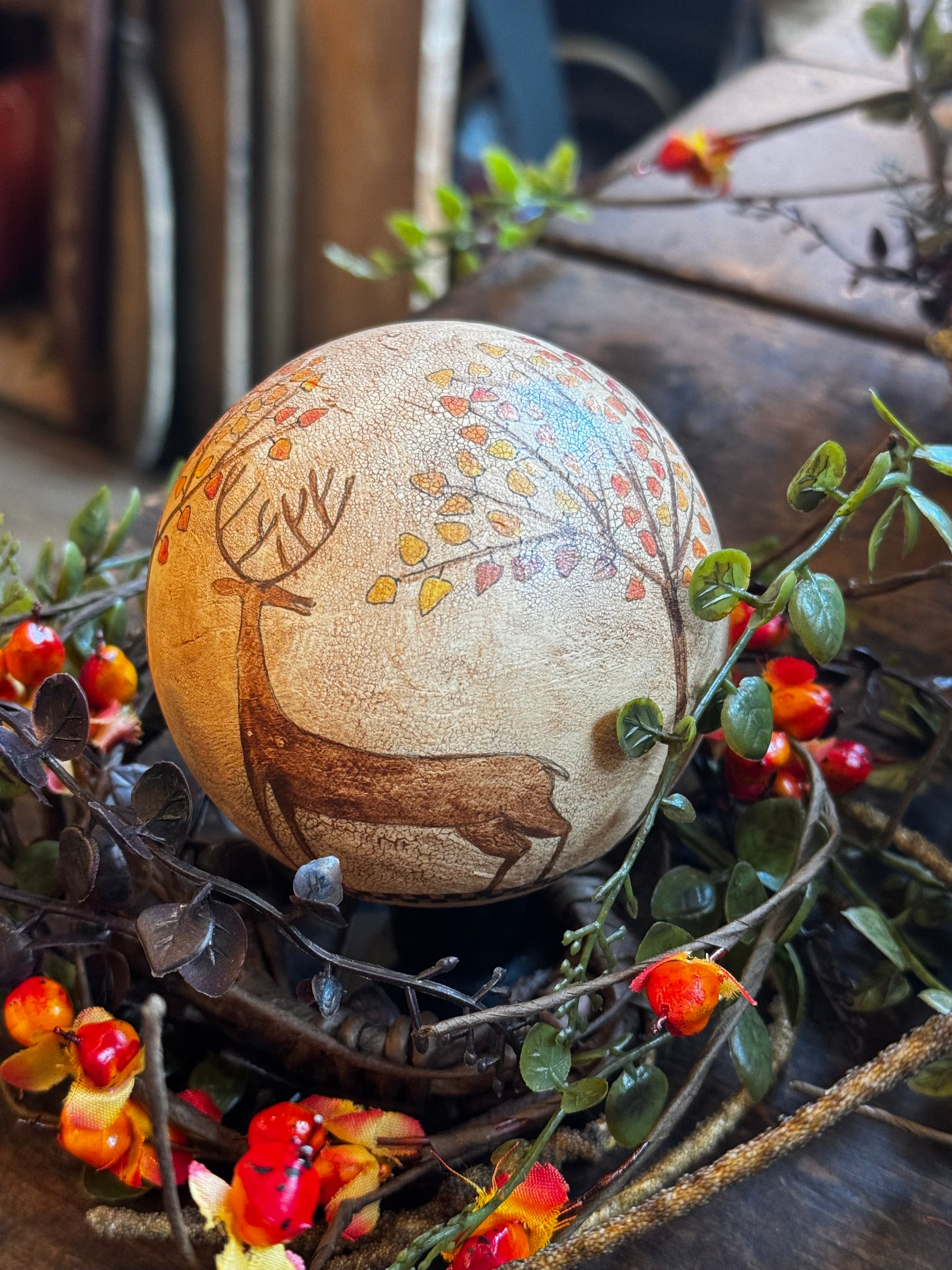 These fabulous antique croquet balls are all hand-painted. Each croquet ball is a true antique so they may have dense/wear on them. That does not stop Rhonda for making them over the top fabulous. Each croquet ball is hand painted, and the amount of details she puts in each one is unbelievable. These look amazing on a little pewter, candlestick or mixed in a bowl with some bittersweet for the fall season. The best part of these croquet balls is there is no bad angle. Rhonda hand paints around the entire ball so there’s never a bad view.