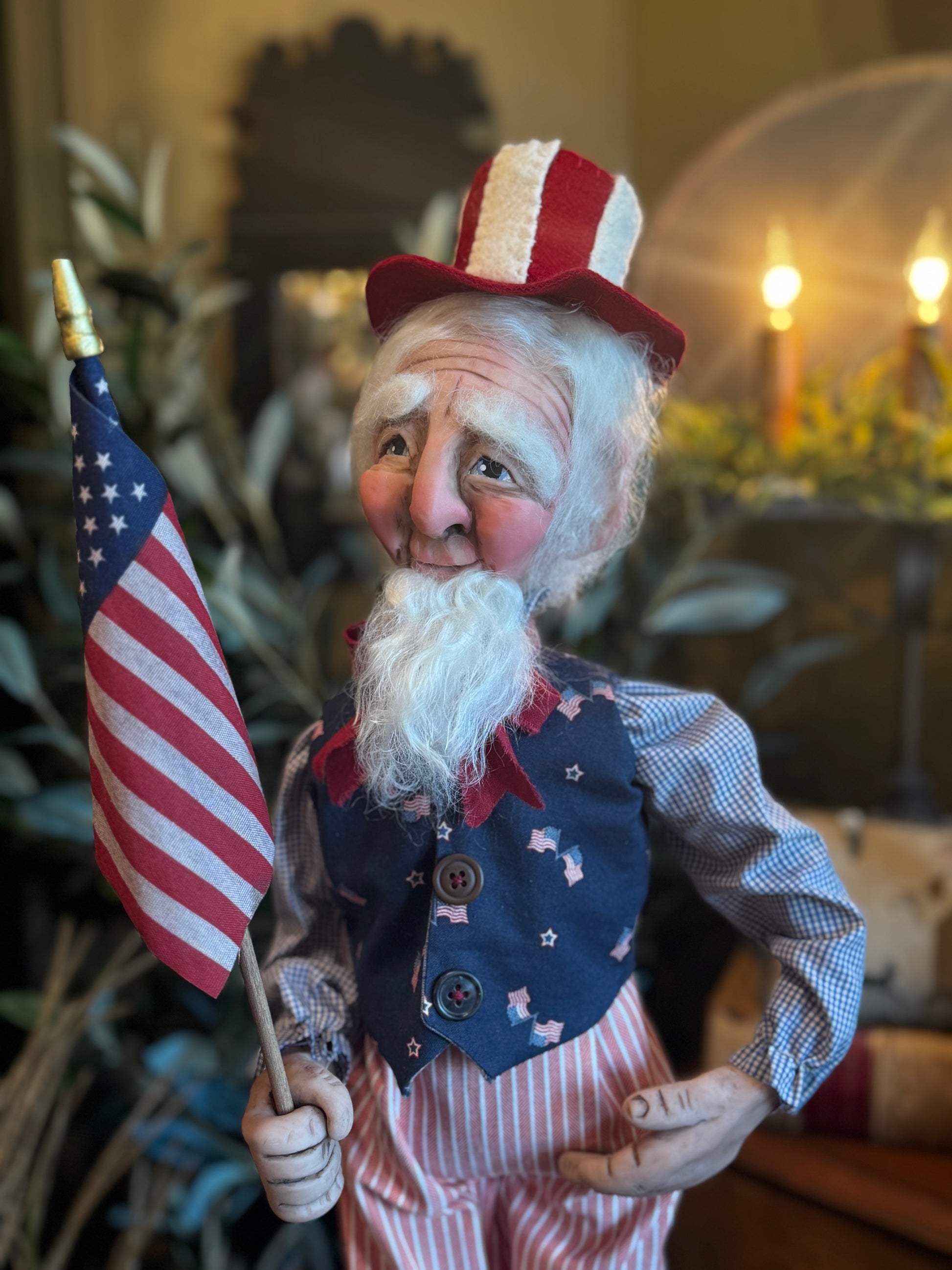 Robin’s clay hand sculpted faces are truly amazing. Each one is hand sculpted so they will never look alike. These Uncle Sams have sculpted hands as well. They each hold a flag and are dressed for all summer. One has a blue vest on and an American flag fabric and the other one has a red vest on that’s made of wool with wool appliqué stars. They both come complete with wool top hats.